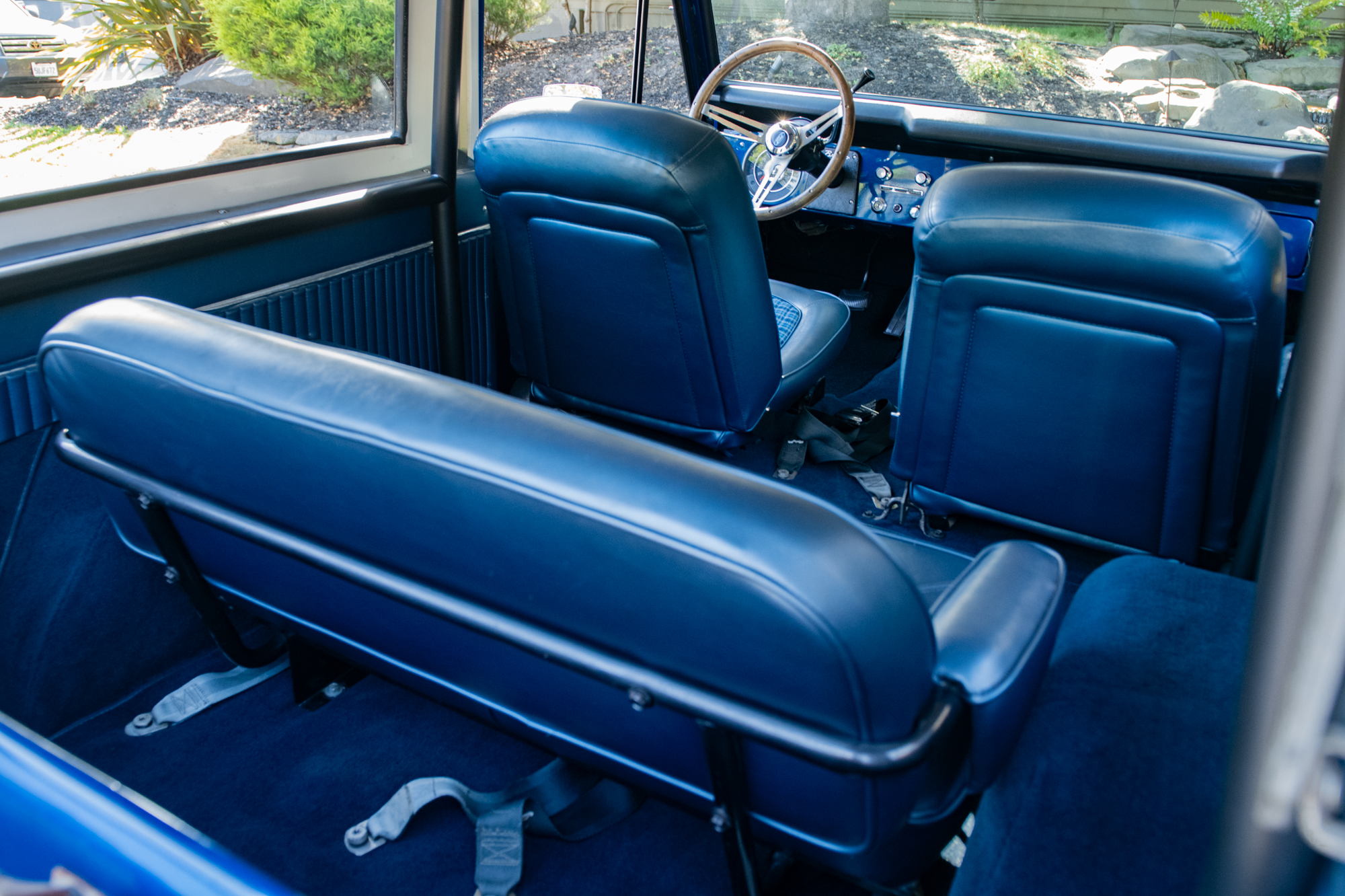 This particular Bronco was restored during its previous ownership between 2013-2023 and had been fitted with extensive desirable options. On the outside, the truck was repainted in Midnight Blue Metallic with a white removable top. The front bumper, grille, moldings, rubber seals, and windshield were replaced in the same year. In regards to safety, a roll bar had been added to the mix and in terms of utility usage, a trailer hitch, a swing-away rear tire carrier, and dual side mirrors were added. The truck currently sits on a suspension lift kit which is supported by 15” steel wheels, fitted with Firestone Destination tires.